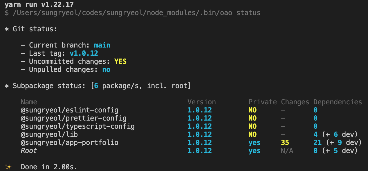 그리고 그 결과는 매우 성공적이었습니다. yarn workspace세팅만 해주고 oao status 로 패키지 상태만 확인해서 빠져 있거나 잘못 설정된 패키지를 수정해주기만 하면 되었기 때문에, 매우 매끄럽게 모노레포 개발이 가능했습니다. 또한 버전도 배포시에 균일하게 유지시켜주기 때문에, 배포간 하나의 패키지만 다른 버전으로 나가게 되는 것을 막을 수 있었습니다.