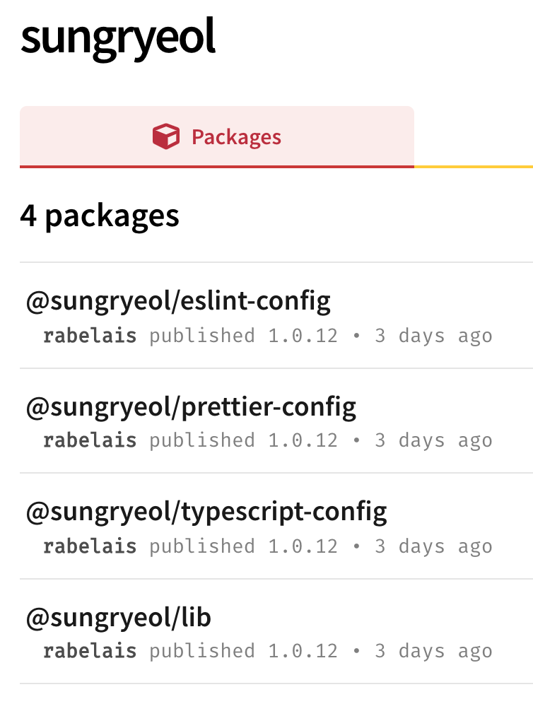 즉 airbnb나 구글에서 하듯 관련 컨벤션과 설정을 우선 패키지화하고, 그 다음 유틸과 컴포넌트를 패키지화합니다. 다른 프로젝트에도 활용될 가능성이 있는 기능만 별도의 패키지(@sungryeol/lib)으로 관리했습니다. 잘 해봐야 블로그 단위의 작업이기 때문에 컴포넌트는 재사용성이 높아보이지 않아 별도의 패키지로 만들지 않았습니다.