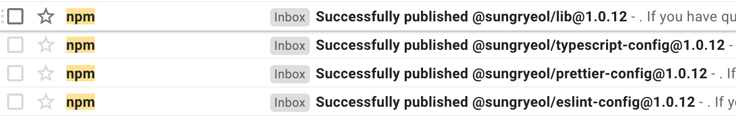 여기서 재미있는 점은 npm publish 기능 자체는 npm 배포 권한에 접근 가능한 환경에서 실행해야 하기 때문에 모노레포 스크립트 도구 종류를 불문하고 대부분 npx 또는 npm 으로만 실행이 가능했습니다. 따라서 개발환경은 yarn 을 사용하고, 배포만 npx 를 사용하는 형태를 취했습니다.