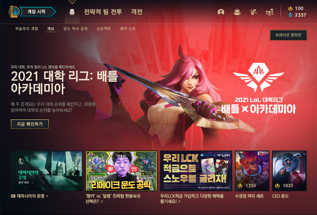 리그오브레전드 클라이언트에 우리 배너가 걸렸다. 이 클라이언트에는 T1과 T2 총 2가지 타입의 배너가 있는데 그중에 가장 큰 것이 T1이다. 라이엇은 (우리에게) T1 배너를 만들어 달라고 했다. 그것도 심지어 D-7, D-6, D-5... D-1일 배너 모두를 만들어 달라고 했다. 만들었다고 해서 걸린다는 보장이 있는 것이 아니다. 그런데 신기한 일이 벌어졌다. 매일 우리 배너만 계속 올라와 있는 것이었다. 신기한 경험이었다.