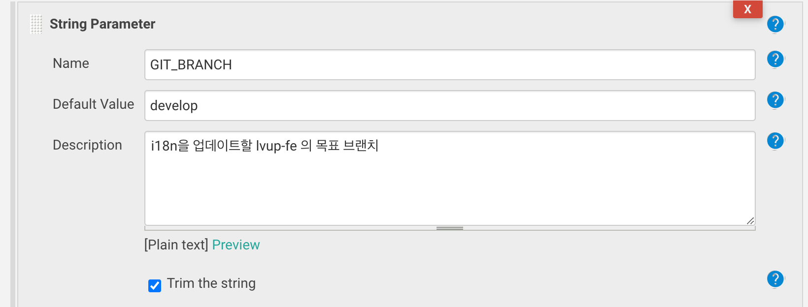 우선 환경 변수에 1:1로 대응하는 젠킨스 string parameter를 만들고, 코드를 모르는 사람도 직관적으로 접근할 수 있도록 설명을 추가했습니다. 앞서 환경 변수를 통하여 프로그램을 조작할 수 있도록 하게 만든 이유입니다.