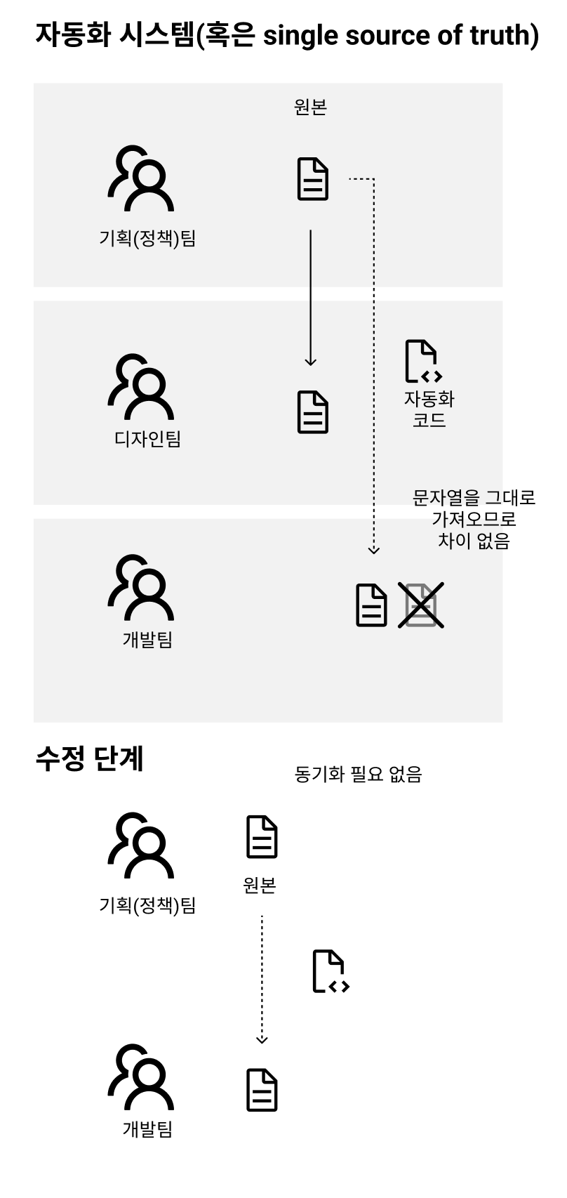 하나의 문자열은 입안 이후 각각 디자인과 개발팀을 모두 거치면서 문자열이 조금씩 바뀌게 됩니다. 이유는 여러가지입니다.