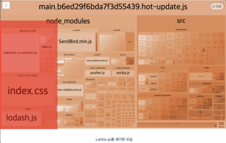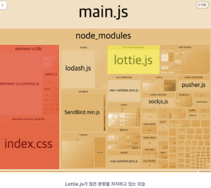 - 번들의 크기가 커야함 → 위의 그림에서 보다싶이 번들크기가 5번째로 큼 (element > lodash > sendbird > moment > lottie)