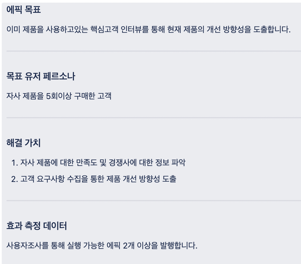 여기까지 완료되었다면 상대적으로 이 뒤는 많은 고민이 필요하지 않습니다. 에픽을 참고로 하여 구체적으로 어떤 고객에게 인터뷰를 요청할지, 어떤 리서치 방법론을 사용할지 결정하면 되니까요! 이 내용들은 다음에 이어서 쓰도록 하겠습니다.😃