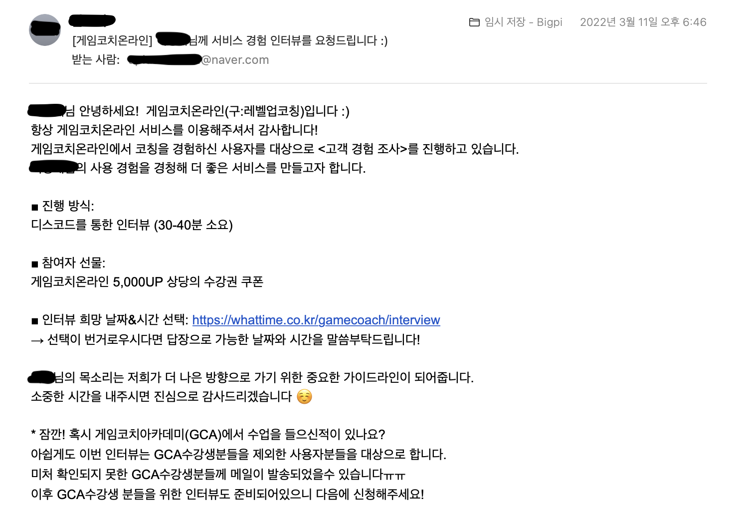 메일에서 살짝 아쉬웠던 부분은 ‘참여자 보상'인데요, 보상 부분을 저희 포인트 단위로 하는 게 아니라 실제 화폐단위(5만 원)로 제안드렸어야 더 직관적이지 않았나 하는 아쉬움이 남네요.🥺