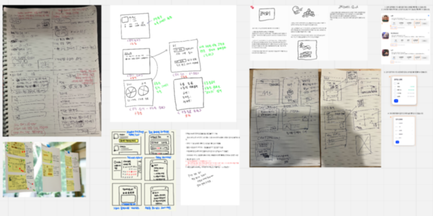 정리된 내용에 따라 구성원들에게 인터뷰 내용을 공유한 뒤 다 같이 페인포인트・터치포인트에 대한 솔루션(HMW)을 아이데이션 했습니다. 포스트잇에 각자의 아이디어를 적어서 올리고 그에 대한 구체적인 아이디어 스케치도 간간히 그리는 형태로 진행했습니다. 역시 여러 명이 모이니 더욱 다양하고 좋은 아이디어들이 많이 나오더라고요!👍