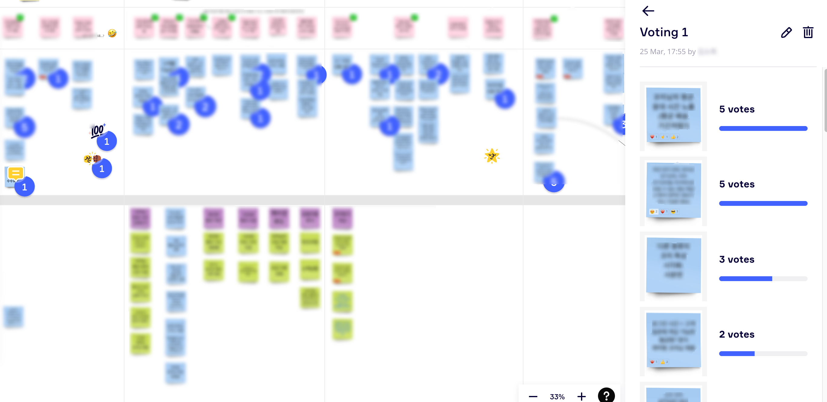 이후 서로의 아이디어를 공유하고 간단하게 공감하는 아이디어에 투표하는 시간도 가집니다. 투표는 이후 프로덕트 사이드에서 액션 아이템을 선정하는데에 참고합니다.😎