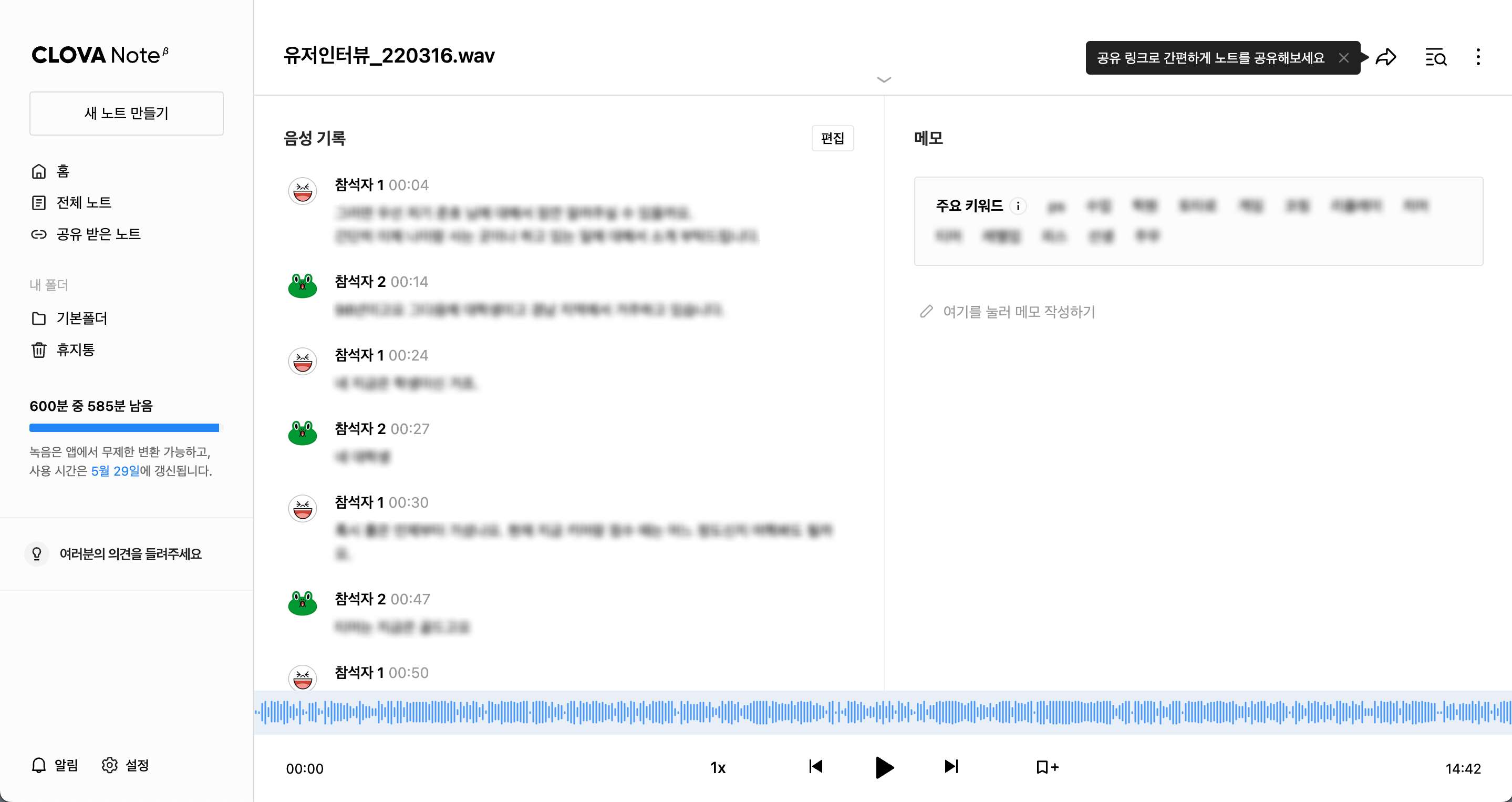 인터뷰 결과 정리는 녹취록을 작성하는 것에서 시작합니다. 저는 주로 구글 스프레드시트를 사용하여 인터뷰당 하나의 시트를 사용하여 녹취록을 작성합니다. 처음부터 끝까지 다시 들으면서 시간의 흐름에 따라 놓치지 않고 작성해주세요. 클로바 노트를 사용하시면 조금 더 수월하게 작업하실 수 있습니다.😁