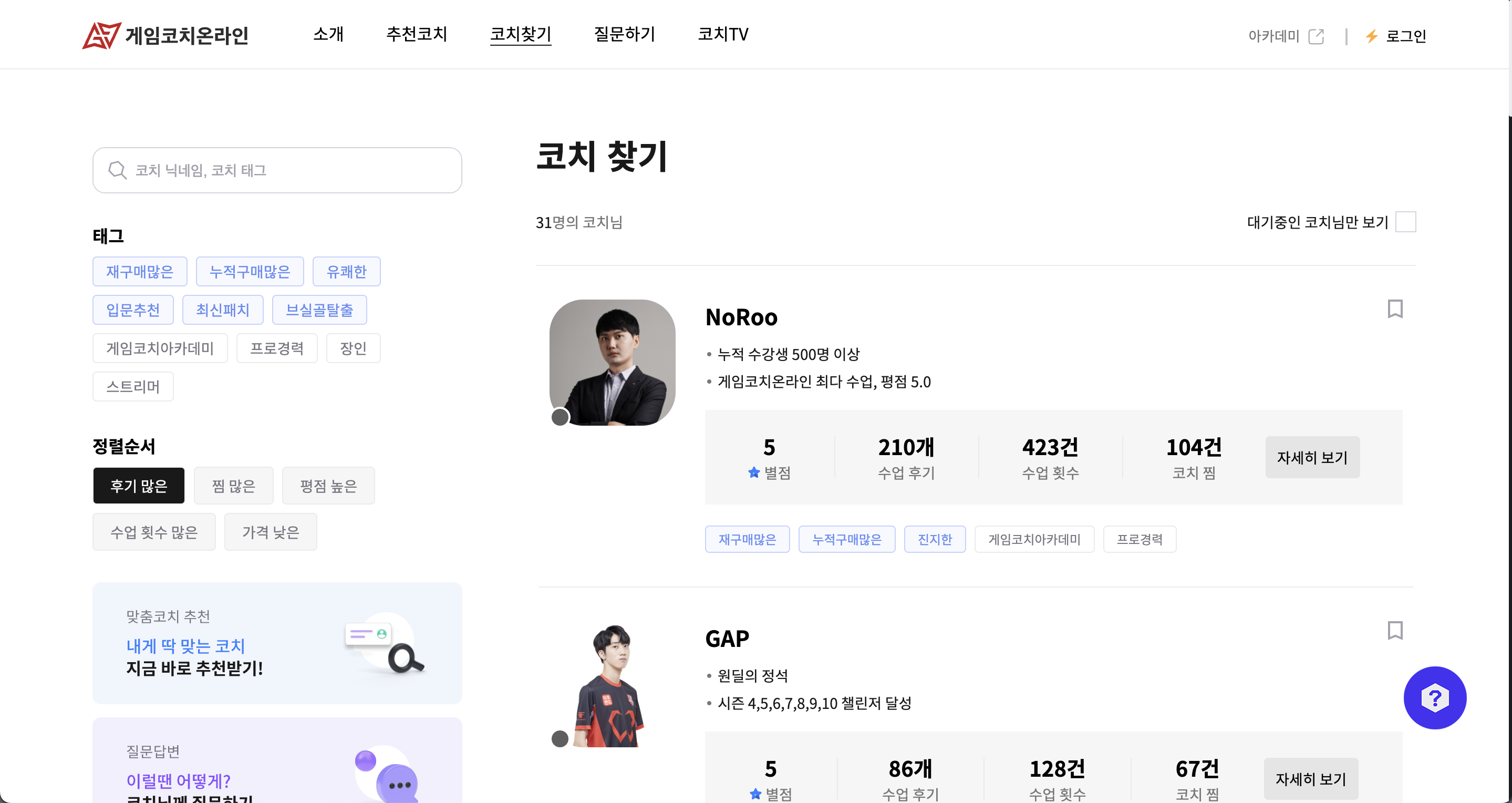 예를 들어 게임코치온라인의 코치님들을 목록으로 볼 수 있는 기능인 ‘코치 찾기'의 경우 유저 인터뷰에서 ‘한 페이지에 여러 명의 코치님을 한눈에 볼 수 있으면 좋겠다.'라는 의견이 반복적으로 나왔어요. 인터뷰 결과 대로라면 저희는 코치님을 소개하는 UI의 볼륨을 줄여 최대한 여러명의 코치님이 보이도록 레이아웃을 변경해야겠죠?