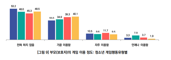 그것을 대략 요약하면 게임을 많이 하거나 전혀 하지 않는 부모의 성향이 아이들이 과몰입 및 과몰입 위험군에 주는 영향은 거의 없다는 사실입니다. 수치가 더 유의미하게 높다라고 판단할 만한 근거가 없어요. 제가 그 부분만 캡처해서 위에 가져왔습니다. 이런 것들은 눈으로 보는 것이 제일 좋습니다. 여러분들은 이 그래프를 보면서 부모가 게임을 전혀 하지 않으면 자녀의 과몰입 가능성이 높고, 부모가 게임을 많이 하면 과몰입 위험군의 가능성이 높다고 말할 수 있나요?