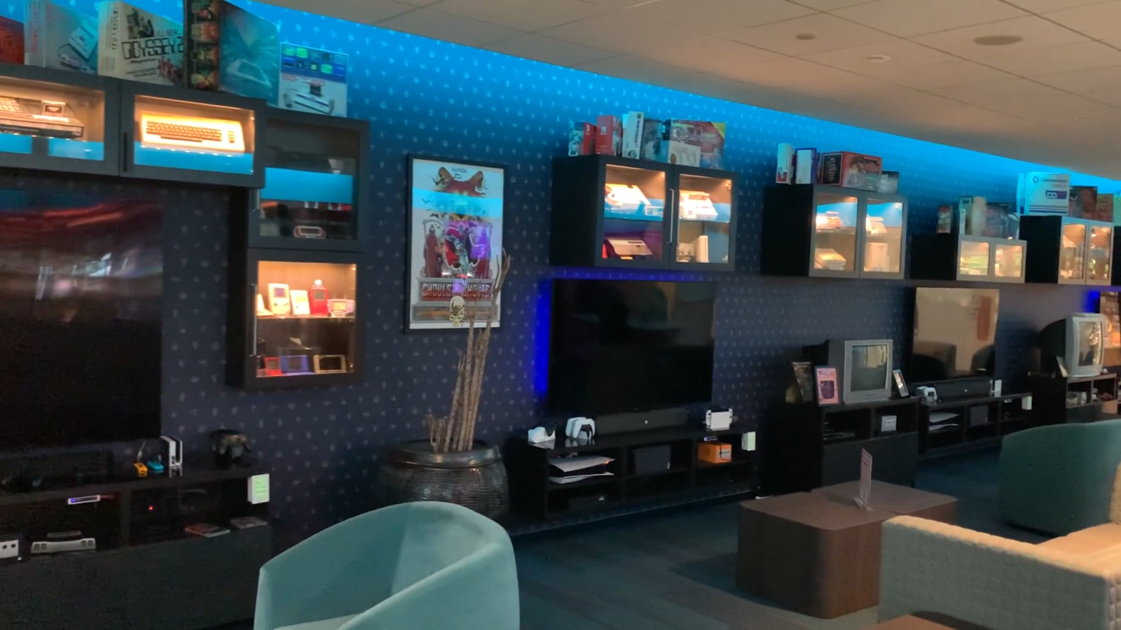 PS5와 같은 최신 기종을 포함 슈퍼패미컴 등 고전 게임기도 전시되어 있고