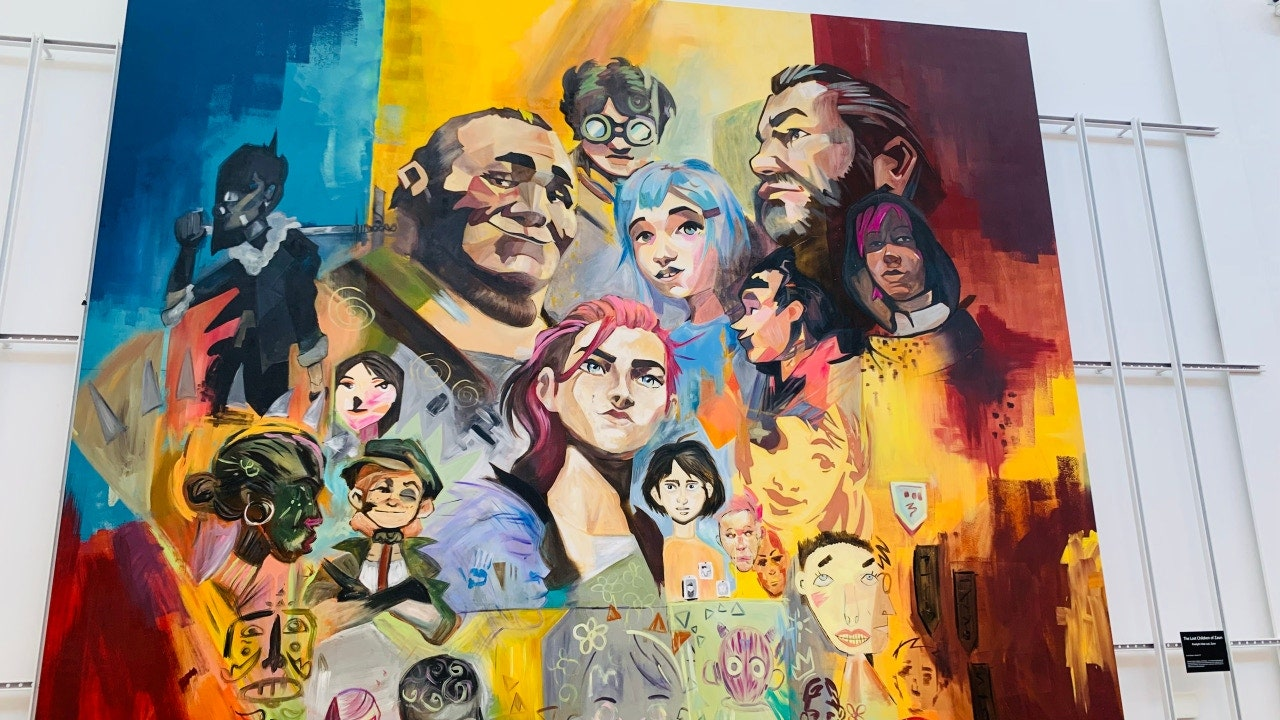 뒤에는 아케인의 거대한 수채화 포스터가 자리잡고 있습니다