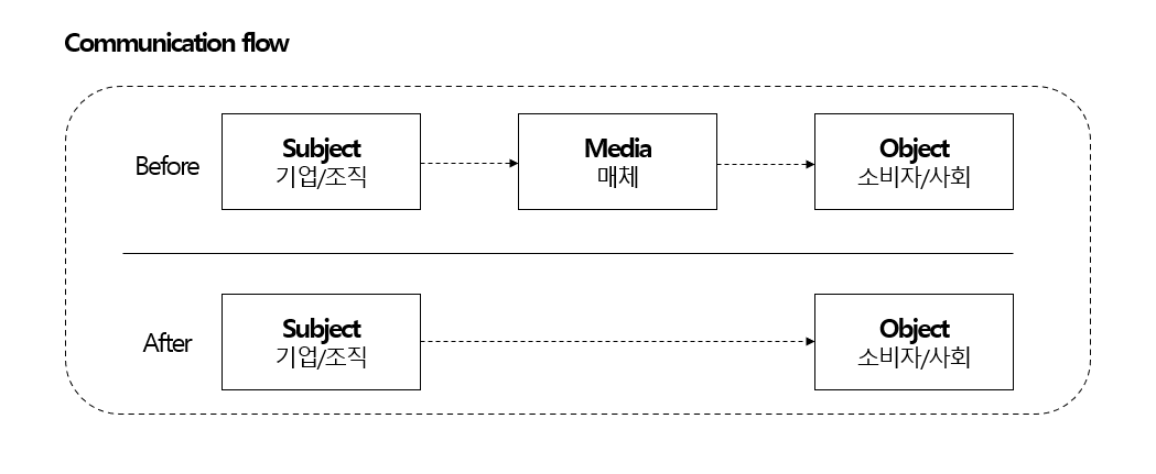그런데 여기까지는 사실은 여전히 PR의 영역입니다. 그 이유는 이 PR 자체는 최종 커뮤니케이션 대상이 소비자와 사회인 것이 동일하기 때문입니다. 오직 그 중간에 미디어가 있었던 것뿐이지요. 그래서 이 괴리에 대한 이해의 시작은 '커뮤니케이션 대상이 변경되었다'라는 사실의 사전 인지부터입니다. 따라서 여기서 작은 결론을 내리면 우리는 여전히 PR이 필요합니다. 오직 커뮤니케이션해야 하는 대상만 달라졌습니다. 미디어에서 소비자로 또 사회로 변경된 것입니다.