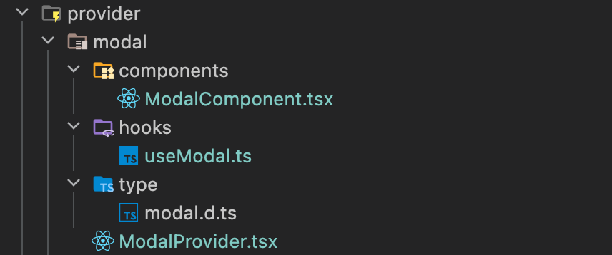 뿐만 아니라 이 모달을 사용하기 쉽도록 custom hook을 만든다면 hooks 디렉토리 안에도 모달 관련 파일이 들어가 있게 됩니다.