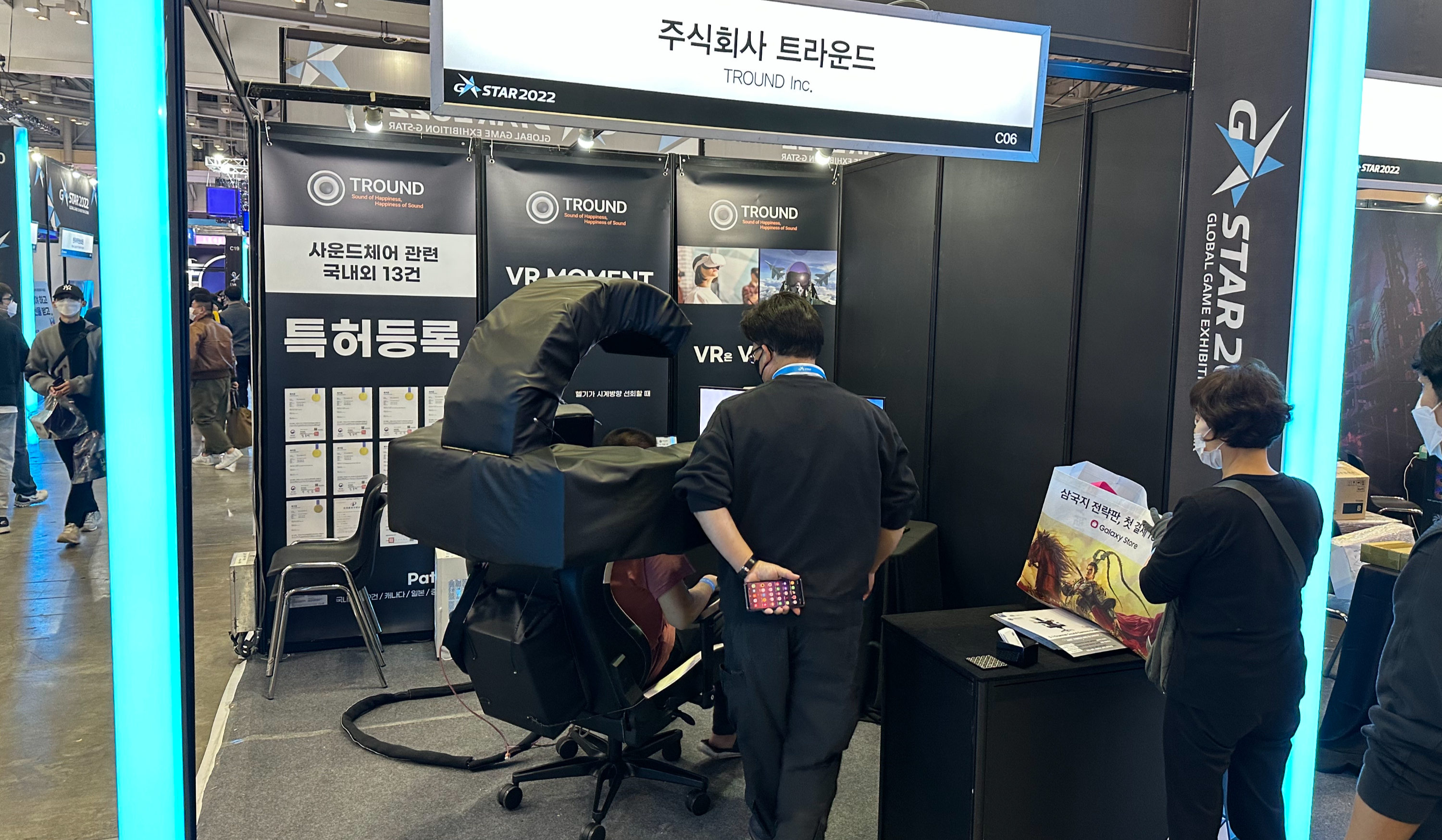 트라운드는 개인적인 생각으로 아직 너무 초기 버전의 상품을 들고 B2C에 오신 것 같아요. 추구하는 방향은 이를 테면 '게이밍 체어의 미래 버전' 이렇게 표현할 수 있을 듯합니다. 의자에 앉았을 때 우리 몸이 닿는 부분에는 진동이 오고요. 서라운드 스피커가 귀 주변에 있는 구조입니다. 보여주는 영상은 모던워페어였는데 시네마틱 영상에 맞춰 진동과 소리가 들리는 형태였습니다. 경험 자체는 아주 신선한 것은 아니었는데 보급화라는 부분을 계속 생각해보고 있었습니다.