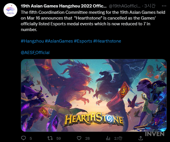 특별한 소식들이 많지 않은 주간을 보내고 있고요. 네거티브 이슈들이 있었습니다. 그 중에 기억하실만한 한가지만 공유드리면 올 가을 항저우 아시안게임에서 정식 종목이 될 예정이었던 하스스톤 종목이 최종 제외 되었는데요. 이유는 중국내에서 서비스를 하지 못하고 있기 때문입니다. 블리자드는 지난해 NetEase과의 계약을 종료하면서 여러 잡음이 들렸는데요. 결과적으로 아직도 서비스 회사를 찾지 못했습니다. 이로서 블리자드 게임은 아시안게임에 최종 없게 되었습니다. 이로서 이스포츠 종목에 대한 또 한번의 전통 스포츠 시장의 평가가 있을걸로 예상이 되네요.