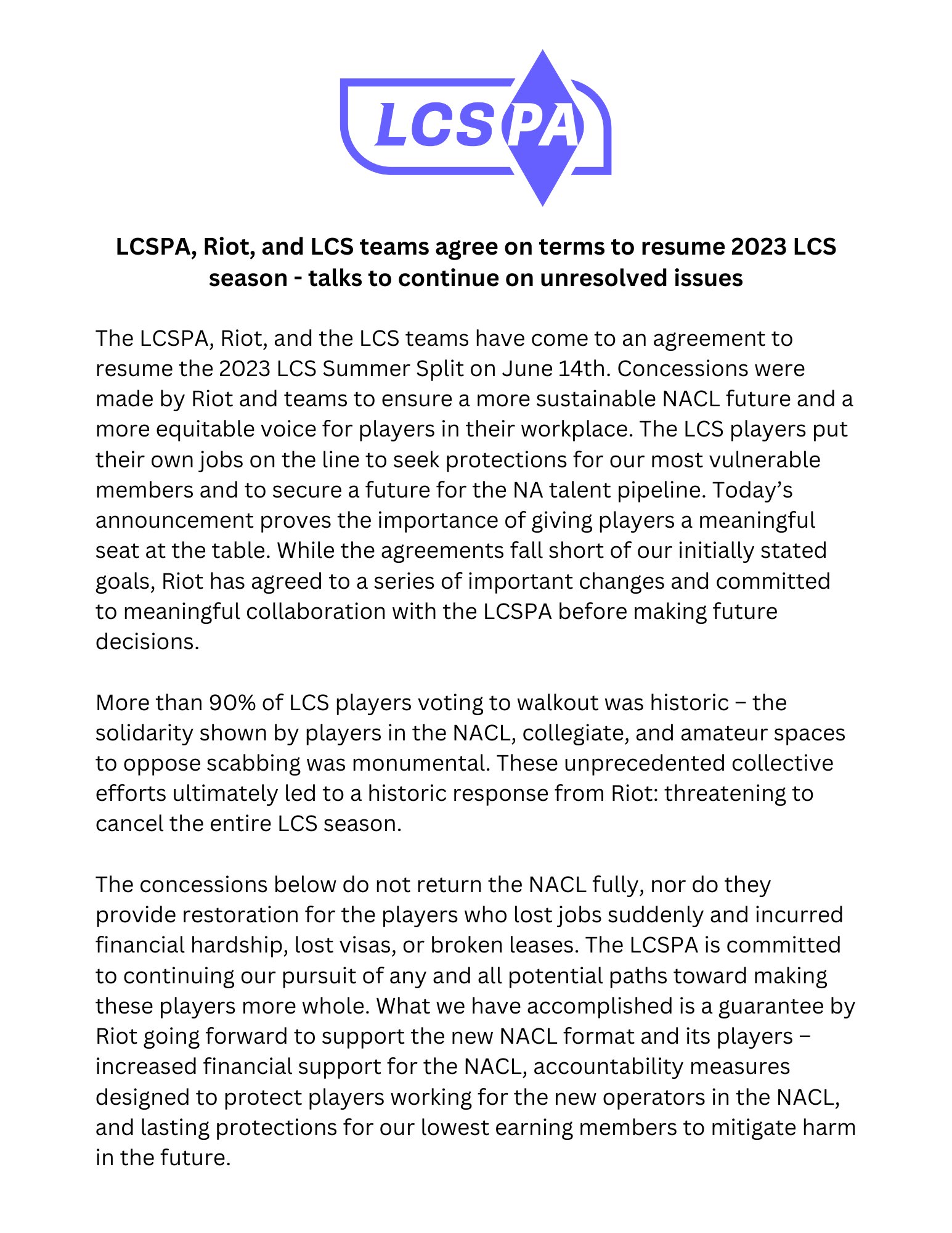 먼저 사건이 발생한 후 LCS 선수 협회는 라이엇에 성명서를 제출했었습니다. 라이엇은 성명서에 포함된 제안에 대해서 몇몇의 답변을 내 놓았습니다. 첫째로는 LCS 선수 협회는 발로란트처럼 1군과 2군 리그 간의 승격/강등을 도입하자는 제안입니다. 라이엇의 대답은 프랜차이즈 슬롯을 위해 1000만 달러 규모를 지불한 기존 구단과의 형평성에 어긋나기 때문에 불가능하다는 입장을 선수협에 전달했습니다. (리그 수익 중 일부가 리그 소속팀에 배분되게 되는데) 결과적으로 수익이 악화되는 것이기 때문에 프랜차이즈 모델을 해치는 것이라고 설명했습니다.