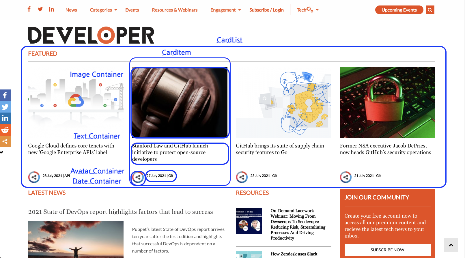 다음은 CardList 컴포넌트를 화면상에 보이는 유의미한 단위 수준으로 분리한 것이다. CardList라는 외연에는 다음과 같이 CardItem, Image, Text, Avatar, Date 컴포넌트가 속한다. 또는 화면에 나타나지 않지만, 내부에서 동작하는 시간 계산 모듈, Image 로드 모듈 등 각 모듈별로 관심사 분리를 하여 구분할 수도 있다.