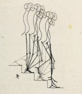 프랑스의 생리학자 마레는 사람이 움직일 때 뼈나 관절의 위치가 어떻게 변하는지 알고 싶어 했다. 그는 모델에게 전신을 덮는 옷을 입힌 다음, 그 옷 위에 사지의 주요한 뼈를 따라 하얀 선을 그었고 주요 관절부터 하얀 점을 크게 찍었다. 그 후, 마레는 모델이 검은 배경 앞에서 움직이는 연속 사진을 찍었다. 사진에 나타난 모습은 육체가 사라진 점과 선의 집합이었다. 추상이 된 것이다.