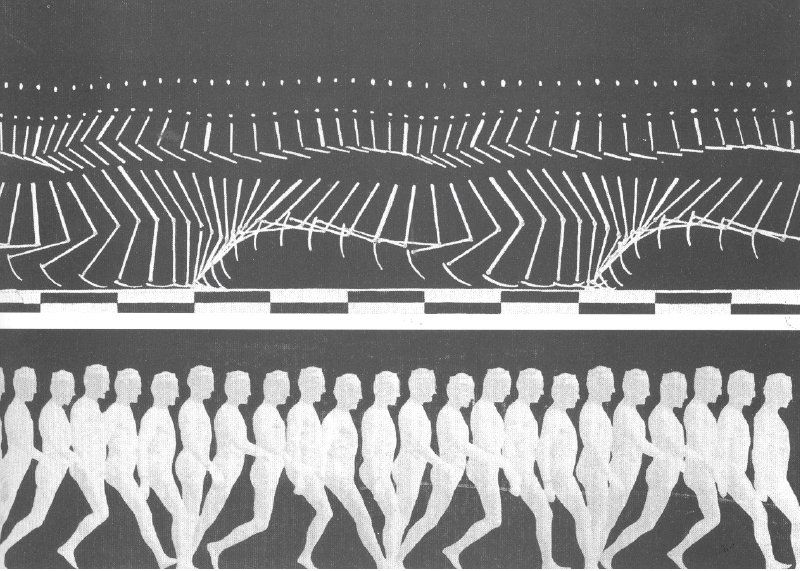 프랑스의 생리학자 마레는 사람이 움직일 때 뼈나 관절의 위치가 어떻게 변하는지 알고 싶어 했다. 그는 모델에게 전신을 덮는 옷을 입힌 다음, 그 옷 위에 사지의 주요한 뼈를 따라 하얀 선을 그었고 주요 관절부터 하얀 점을 크게 찍었다. 그 후, 마레는 모델이 검은 배경 앞에서 움직이는 연속 사진을 찍었다. 사진에 나타난 모습은 육체가 사라진 점과 선의 집합이었다. 추상이 된 것이다.