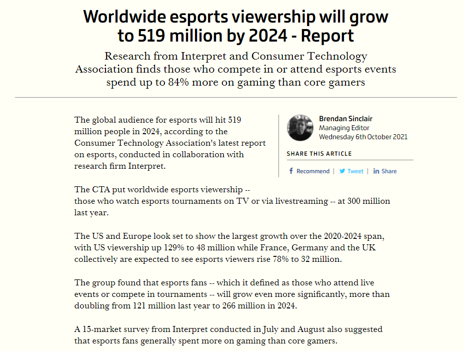 이 기사를 보시면 '이스포츠의 전 세계 관객 수는 2024년에 5억 1900만 명에 달할 것'이라고 합니다. 어마어마한 숫자입니다. 이 말은 다르게 표현하면 우리 팀에 흘러올 가능성이 있는 물의 양입니다. 그런데 우리는 다음 문장도 주의 깊게 살펴볼 필요가 있습니다. '미국과 유럽은 2020-2024 기간 동안 가장 큰 성장을 보일 것으로 예상, 미국 시청자는 129% 증가한 4,800만 명이고 프랑스, 독일, 영국은 E스포츠 시청자가 78% 증가한 3,200만 명에 이를 것' 이 말은 무엇을 의미하나요? 한마디로 말씀드리면 우리가 유치해야 하는 물이 해외에 많다는 뜻입니다. 이 말을 들을 때 긴 한숨이 나올 수 있어요. 당장 해외와 관련된 어떤 일을 하는 것은 너무 부담스러우신가요? 제가 여러분의 팀의 사정을 너무 모르고 하는 소리인가요?