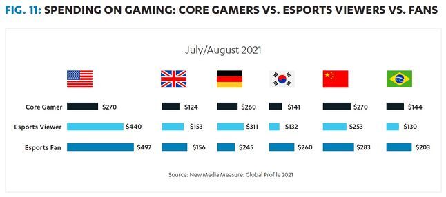 이 팬이라는 것은 팀 브랜드의 가치에 있어 정말 놀라운 역할을 하고, 대단한 효과를 가져다줍니다. 지금 위에 있는 이미지를 보면 팬(Fan)이라는 단어가 사용된 곳은 'Esports Fan' 외로는 없습니다. 그런데 육안으로 봐도 예상이 되는 것처럼 거의 모든 국가에서 'Esports Fan'이 그렇지 않은 구분들에 비해 게임에 돈을 많이 씁니다. 만약 우리가 게임사(종목사)에서 일하는 마케팅 담당자라면 이 지표를 보고 무슨 생각을 하게 될까요? 너무나 당연한 이야기이지만 우리 게임의 'Esports Fan'을 늘려야겠다고 생각할 것입니다. 이것은 저의 개인적 주장 같은 것이 아닙니다. 그저 단순히 지표에 근거한 타당한 해석입니다.