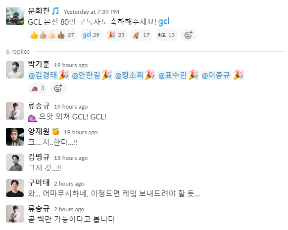 그래서 우리 단체 슬랙방에 축하 메시지가 쏟아지고 있습니다